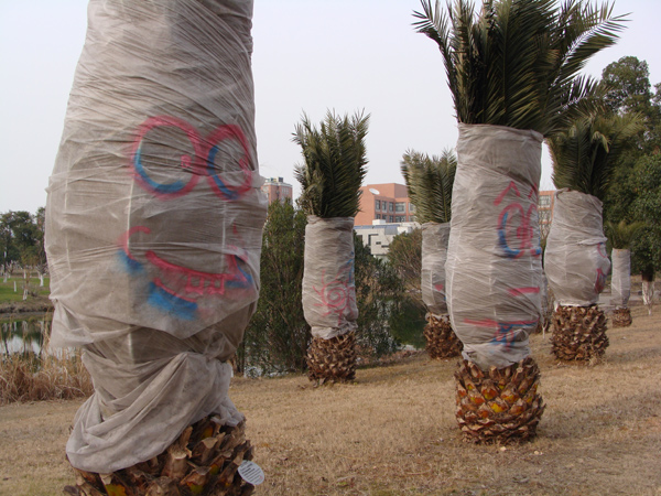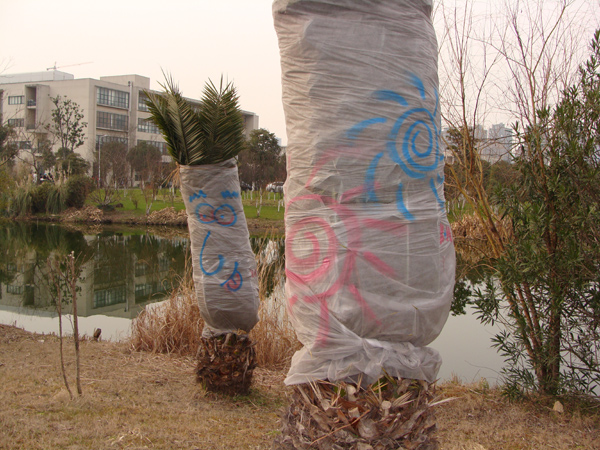 中國寧波網(wǎng)手機(jī)記者138****5186:拍攝于3月8日下午,諾丁漢大學(xué)校園內(nèi)。冬天的時(shí)候校園內(nèi)的樹要用塑料保護(hù)起來,于是大學(xué)生們就搞了些噴繪來裝點(diǎn)!怎么樣,很搞笑也很有創(chuàng)意吧。!