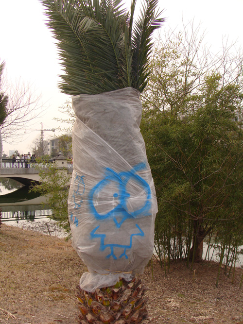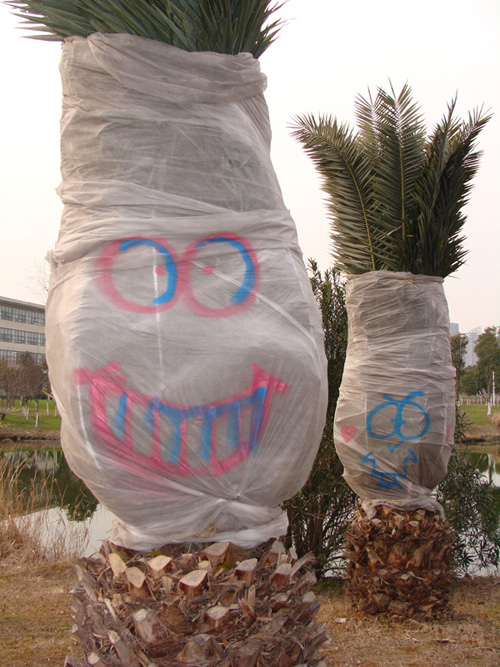 中國(guó)寧波網(wǎng)手機(jī)記者138****5186:拍攝于3月8日下午,諾丁漢大學(xué)校園內(nèi)。冬天的時(shí)候校園內(nèi)的樹要用塑料保護(hù)起來(lái),于是大學(xué)生們就搞了些噴繪來(lái)裝點(diǎn)!怎么樣,很搞笑也很有創(chuàng)意吧!!