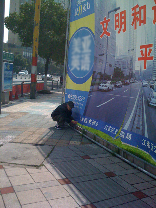 中國寧波網(wǎng)手機記者135****8178:昨天中午在靈橋東碰到一位給廣告牌系繩子的老人,也許是擔心廣告牌會被吹倒,他才做出這樣的不平凡舉動。這個不經(jīng)意的舉動深深觸動我的心田。每一個人都能像他一樣對這個城市有一份責(zé)任和關(guān)愛,那將是一個什么樣的美好世界!