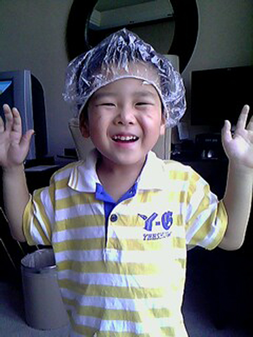 小朋友住賓館,從浴室里找到一個(gè)浴帽,搗鼓一陣,戴在頭上!欣然向我打招呼,真的好可愛。!