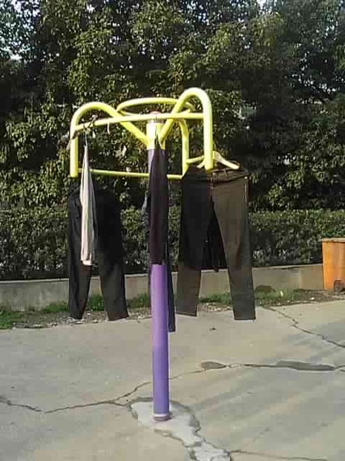 居民小區(qū)里鍛煉身體用的體育器材成了衣架,鮮新不?滿足自己的同時也想想是不是給別人帶來了不便?!