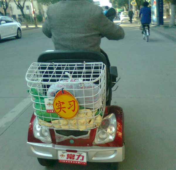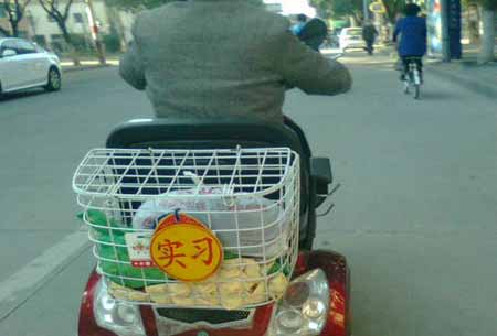 中國寧波網(wǎng)手機(jī)記者158****8581:今天早上經(jīng)過翠柏路,看見一個大媽寄著電動三輪車,后面掛著一張汽車實(shí)習(xí)標(biāo)志,挺有創(chuàng)意的。難道電動三輪車也有十二個月實(shí)習(xí)期了?好像沒有聽說過這個新規(guī)啊,呵呵。