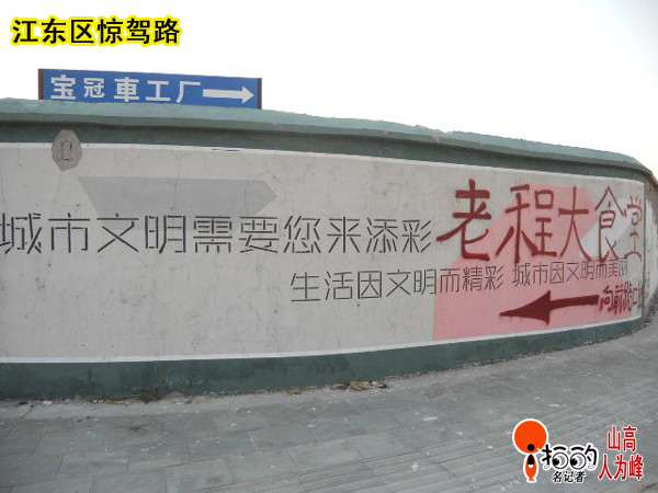 老程可能就是附近那個大食堂的老板!讀一讀圍墻上的文明標(biāo)語,再看一看程老板那歪歪扭扭的大路標(biāo),怎么著心里都別扭,很不‘給力’……”