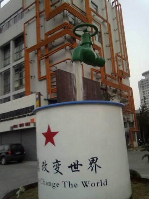 去江東某時尚餐廳吃飯,是由老廠房創(chuàng)意改建而成,在門口看到這個大水杯和水龍頭,傳說中的無根之水!