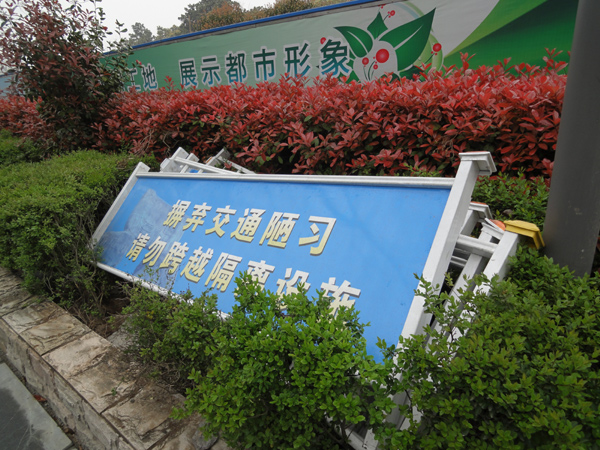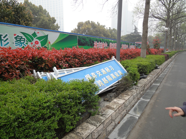 中國寧波網(wǎng)手機(jī)記者135****6815:交通隔離欄,本應(yīng)該是用來維護(hù)交通秩序、創(chuàng)建城市文明的,現(xiàn)在卻被棄之一旁,壓在了綠化帶上。這一場景與宣傳口號“摒棄陋習(xí)、都市形象”等字眼組合起來,不知道大家作何感想?4月8日中午攝于江廈街!