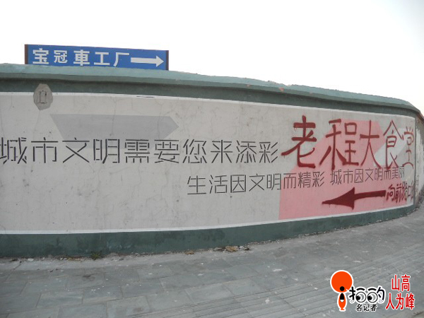 因為原來打算撤換墻面的文明標(biāo)語,所以先進(jìn)行了初步粉刷,等新標(biāo)語出來后,會讓這面墻煥然一新。談到這個路標(biāo)是否是“老程大食堂”的工作人員寫上去的,是否會對他們進(jìn)行處罰?