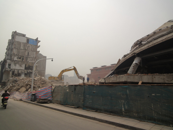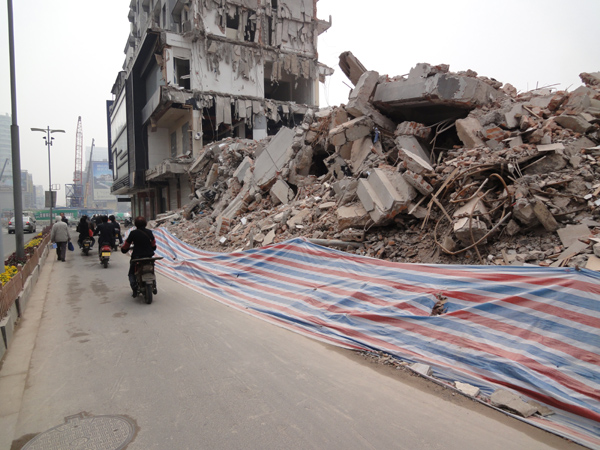 中國寧波網(wǎng)手機記者135****6815:在中山東路新江廈商城對面的拆遷工地上,廢墟如山,塵土彌漫,鏟車不停地運作著,而旁邊就是毫無遮擋窄窄的非機動車道,人車川流,往來不息。經(jīng)過這里時,大家都會抬眼一望后趕緊逃離,我想,大概是這樣“坦白”的拆遷讓大家實在有點提心吊膽吧!
