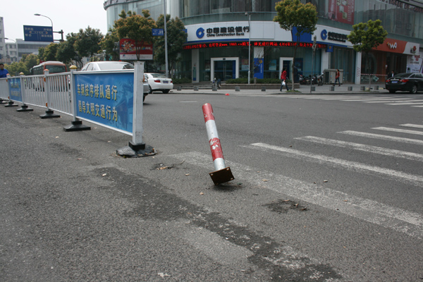 中國寧波網(wǎng)手機記者138****8389:在海曙碶閘街某處路口,警示樁不知道是被汽車還是被非機動車撞歪了!這樣容易傷人,也有礙于市容,請有關(guān)部門盡快修復處理才是!