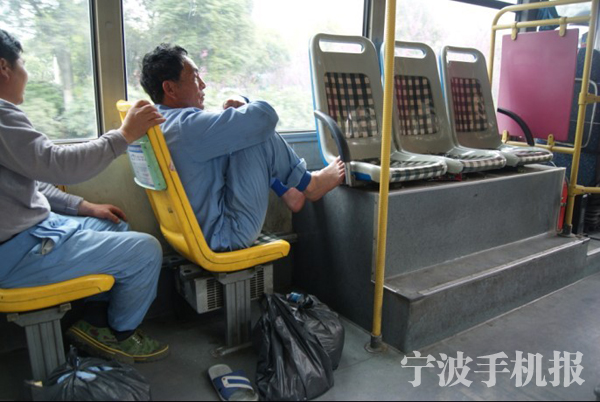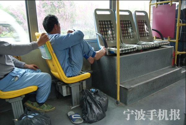 中國寧波網(wǎng)手機(jī)記者伊塔:昨日(4月14日)天氣異常悶熱,下午我坐2路公交出去辦事,結(jié)果在公交車上遇見這一幕:一位穿著類似于“維修工”服裝的老兄把他的臭腳丫翹到前座,本來他前面的座位也是坐著人的,但前面的人都受不了臭味,紛紛坐到后面座位去了。