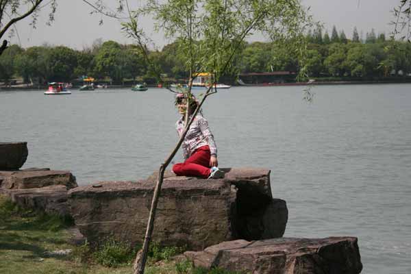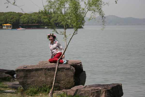 中國(guó)寧波網(wǎng)手機(jī)記者138****8389: 在東錢湖小普陀,一位美女游客坐在湖邊石頭上,擺出一幅丹麥美人魚(yú)的姿勢(shì),讓同伴幫著拍攝,口里喊著:“我像不像美人魚(yú)?”