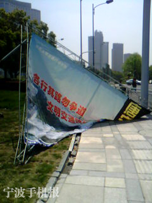 中國(guó)寧波網(wǎng)手機(jī)記者139****8719:在寧波最繁華的地段東門口江廈橋邊,我看到了一幕很不協(xié)調(diào)的場(chǎng)景:一幅宣傳文明交通的巨幅廣告牌,極不文明的歪倒在人行道上,不僅影響了行人的交通,而且發(fā)生在展示城市形象窗口的三江口,讓人汗顏!希望有關(guān)部門趕緊來處理修復(fù)一下!