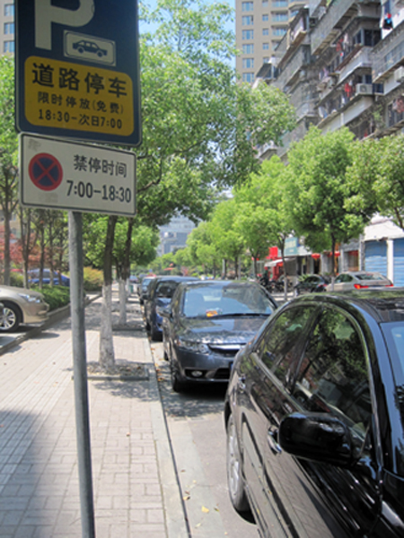 記者攝于4月20日中午11時(shí),雖然立了警示牌,但是居民用車需求太大,違章停車也不得已