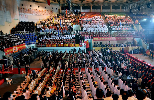 中國寧波網(wǎng)手機(jī)記者137****6468:20日下午,由寧波市總工會(huì)主辦的“百萬職工心向黨,同心建功十二五”五一紅歌會(huì)在寧波市體育館拉開帷幕。參加這次紅歌會(huì)演唱的單位有來自寧波各縣(市)區(qū)工會(huì)以及工業(yè)、直屬、建設(shè)、財(cái)貿(mào)、文衛(wèi)工會(huì)的17個(gè)企業(yè)合唱隊(duì),他們在這里一展歌喉,頌歌頌黨。最后2600多名來自寧波各縣(市)區(qū)的職工代表一齊起立,高歌《沒有共產(chǎn)黨,就沒有新中國》!!
