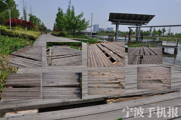 與此相反的是:沿河木制通道有幾十處蹺起或不同層度的腐爛,伸向河邊休閑庭周圍的護(hù)欄橫桿多數(shù)破損,護(hù)欄側(cè)面的防護(hù)鋼纜絕大部分被人為破壞,對(duì)前來游覽休閑的民眾“特別是老人和兒童”存在著極大的安全隱患,希望相關(guān)部門及時(shí)修復(fù),以防后患!