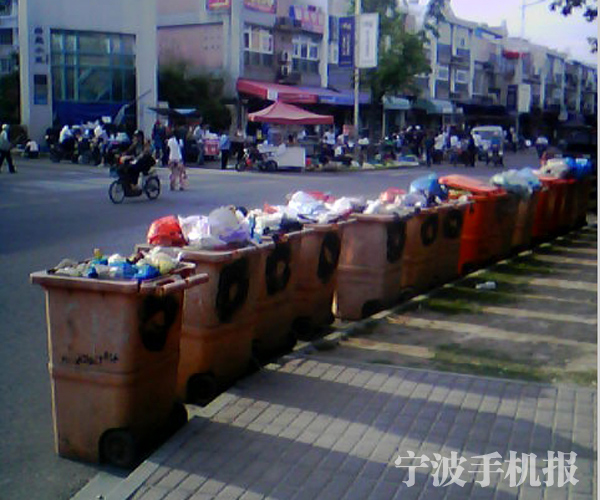 中國寧波網(wǎng)手機記者135****1325:關(guān)愛小區(qū)南大門馬路上的垃圾箱,每天下午四點后就從小區(qū)里拉出來了,等到第二天零晨四點垃圾中轉(zhuǎn)站的再把這些垃圾拉走。