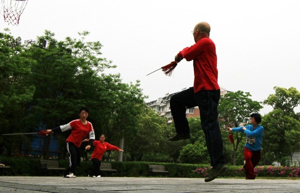 清晨的市游泳館外,幾個(gè)身法矯捷,飄逸瀟灑的男女正在舞劍。