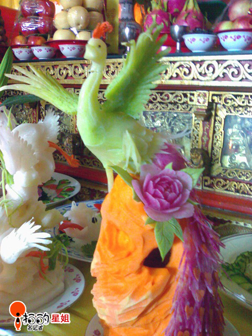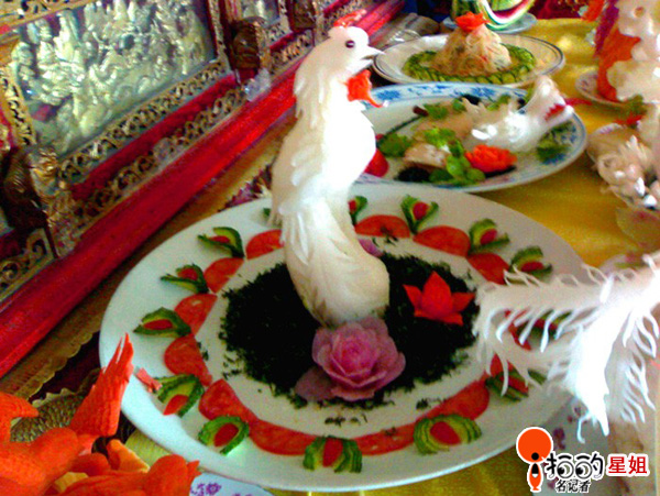 中國寧波網(wǎng)手機(jī)記者138****0218:在一次祭祀活動中,看到雕刻的栩栩如生的鳳凰和孔雀開屏兩道菜,覺得新奇。還有好幾道菜,諸如飛龍,仙鶴等,因?yàn)楦舻帽容^遠(yuǎn),手機(jī)拍的不清楚,所以就只給你上了兩道:鳳凰和孔雀開屏。如果你也見到了,你舍得下嘴吃么?