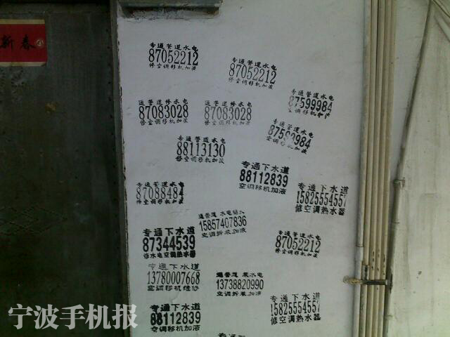 中國寧波網(wǎng)手機(jī)記者138****7863:白鶴新村12幢的樓道被那些小廣告搞的亂七八糟,希望有關(guān)部門對那些惡意的廣告發(fā)布者進(jìn)行懲處,罰他們來清理墻面!