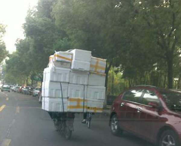 望湖市場旁,一輛嚴重超載的電瓶車若無其事地行駛在馬路上。