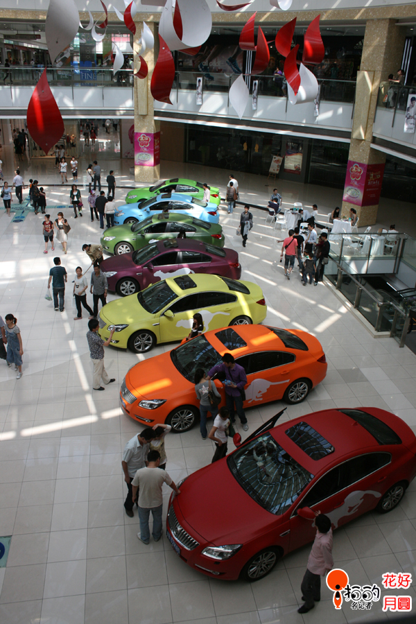 赤、橙、黃、綠、青、藍(lán)、紫,七款不同顔色的別克車排成一排,組成了一道美麗的彩虹。