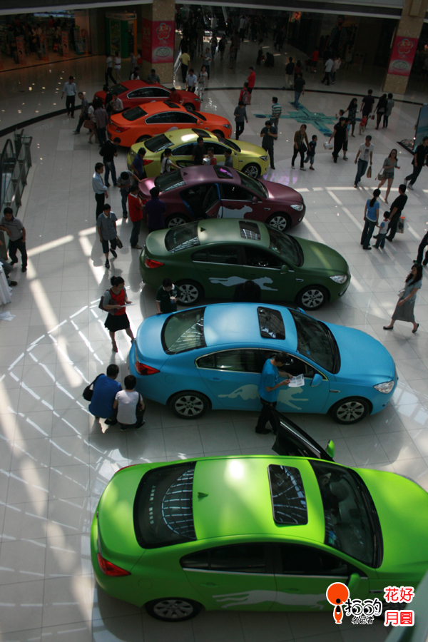 赤、橙、黃、綠、青、藍、紫,七款不同顔色的別克車排成一排,組成了一道美麗的彩虹。
