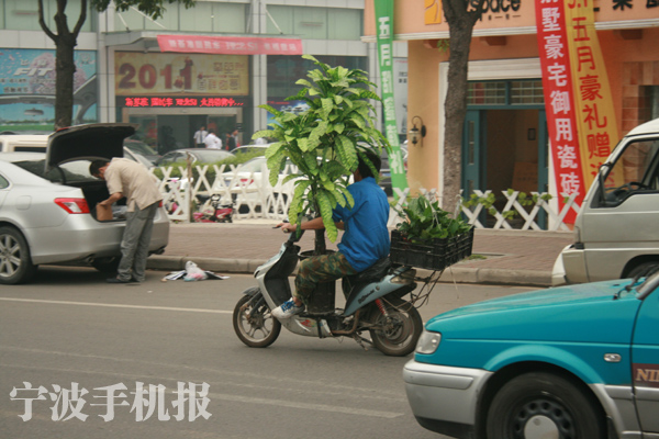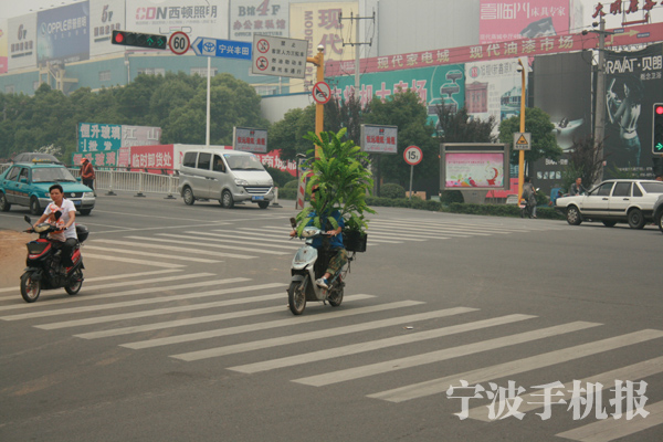 中國寧波網(wǎng)手機記者138****8389:路經(jīng)中興南路和秦達路紅綠燈交叉口時,突然發(fā)現(xiàn)了一棵會“移動”的小樹,定眼一看才發(fā)現(xiàn)是一位小伙騎著電動車抱著棵小樹,本來視線就不好,再加上闖紅燈,如果冷不丁哪冒出輛車子那就悲劇了,遵守交通規(guī)則不可忘呀!