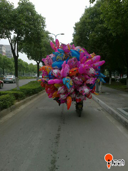 路上見一位老兄騎著車帶了N個氣球,牛!兄弟,再掛兩個氣球你就可以飛上天了,哈哈!
