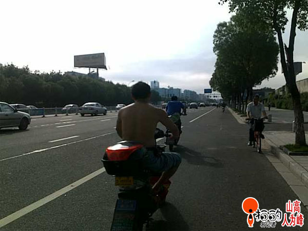 梅雨季,露陽光;天未熱。身先涼;赤膊哥,路上行;礙風(fēng)景,不文明!(6月21日早晨7點(diǎn)半,體育館姚隘路段)