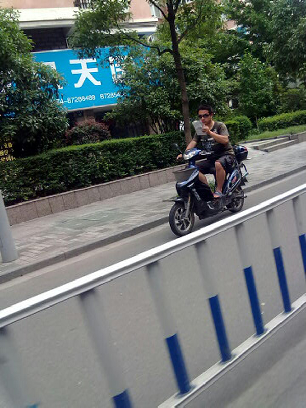 中國(guó)寧波網(wǎng)手機(jī)記者137****5920: 騎車帶人、騎車運(yùn)貨屢見(jiàn)不鮮,邊騎邊看書(shū)的倒還真是少見(jiàn),這樣用功該夸獎(jiǎng)嗎?