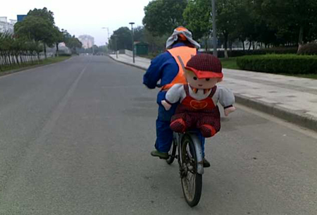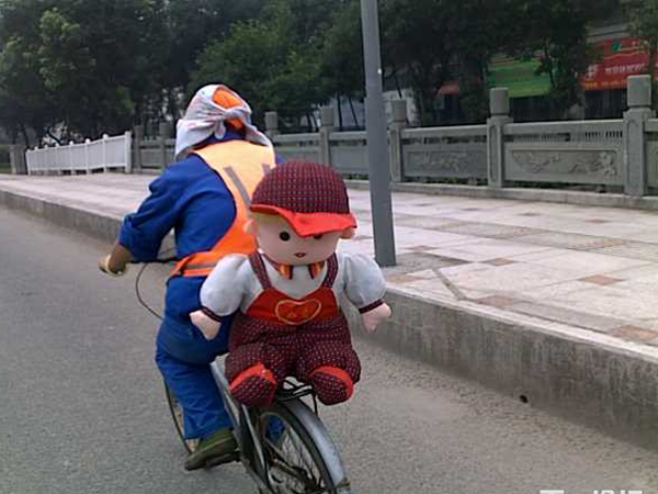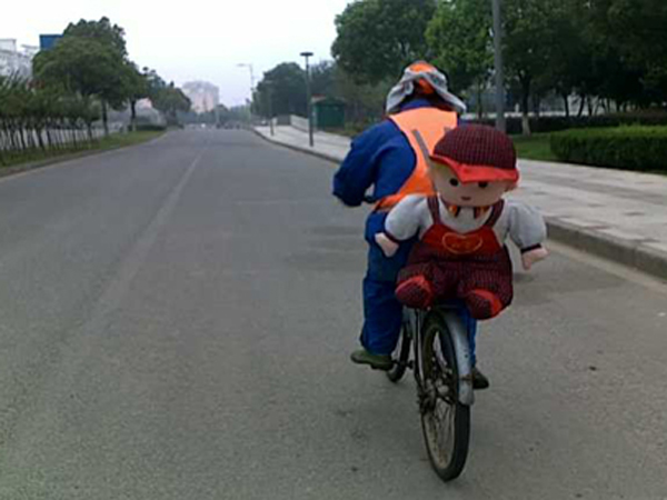 中國寧波網(wǎng)手機記者139****8094:幾天前(7月8日)通途路邊一環(huán)衛(wèi)工人的自行車后坐上,載著一個在路邊拾撿的被遺棄的“胖胖的布娃娃”,扔了很可惜,阿姨要帶“布娃娃”回“新家”,給放假在家的女兒做個伴!