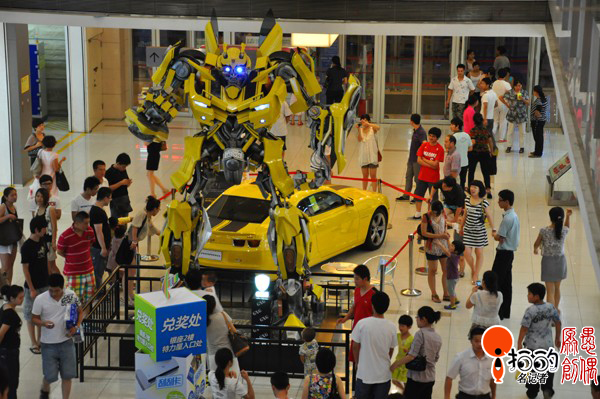 萬達商城入口處車展現(xiàn)場立著一座碩大的變形金鋼模型,吸引著眾多晚上逛商場的游人止步圍觀。