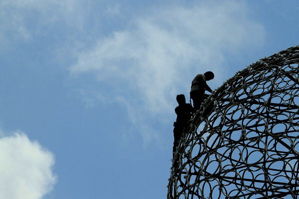 江東興寧路旁,一個在建的娛樂城建設者在屋頂設計了一個碩大的網狀結構的大球。我們且叫它為“山寨版鳥巢”。仰頭看“鳥巢”藍天白云猶似近在咫尺,似有與天公比高之勢。