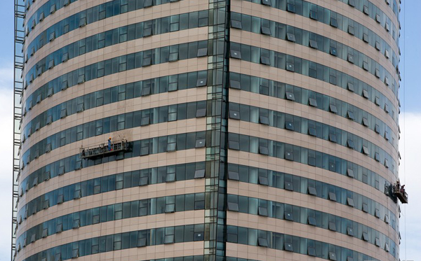 中國寧波網(wǎng)手機記者激活記憶: 拍攝于寧波第一醫(yī)院新大樓。在大樓幕墻外懸著兩只施工吊籃,里面站著幾名清潔工,正在清洗外墻,就像“蜘蛛人”。兩隊人馬,左右開弓,嶄新的大樓和他們渺小的身影形成了鮮明的對比,烈日當(dāng)頭,依然辛勤勞作,令人敬佩。