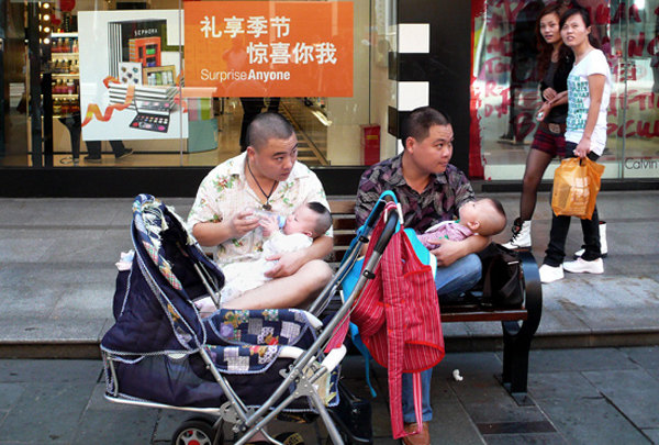 寧波天一廣場內(nèi)一休息長椅上,兩位超級奶爸在細(xì)心喂養(yǎng)小寶寶,如此場景令人忍俊不禁!