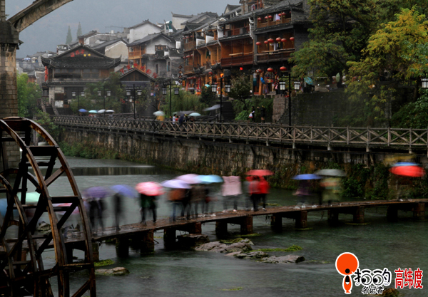 中國(guó)寧波網(wǎng)手機(jī)記者江東-高緯度:雨中鳳凰,纏綿悱惻,朦朧中略帶醉意,令人留連忘返。游人撐著五顔六色的雨傘游走城中,好似一條彩龍?jiān)谟蝿?dòng),給古樸的鳳凰城帶來了另一番景色。