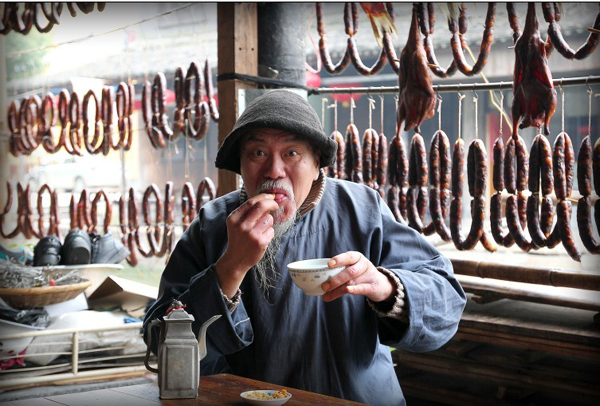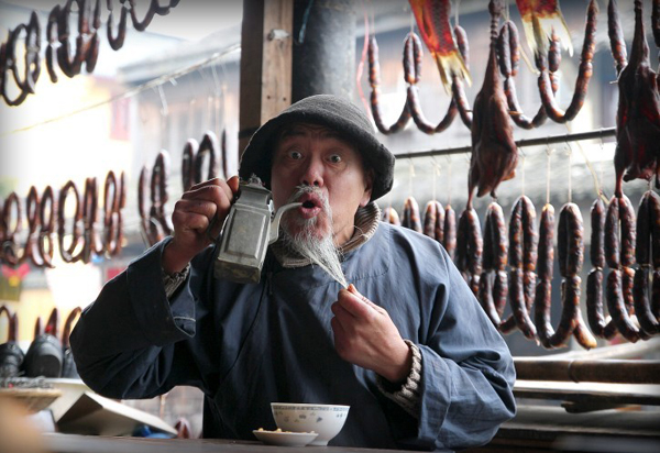 中國(guó)寧波網(wǎng)手機(jī)記者百味人生: 沿著古鎮(zhèn)老街漫步,遇見了一個(gè)“明星級(jí)”的人物,那就是“寶麟酒家”的掌柜。寶麟酒家的老掌柜,現(xiàn)在儼然是安昌的形象大使,穿著青色長(zhǎng)衫帶著黑氈帽,更留一縷雪白長(zhǎng)須,拿著蠟酒壺蘸著花生米,形象著實(shí)是書上標(biāo)準(zhǔn)的紹興人打扮。