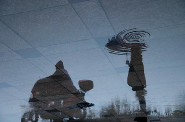 雨,江浙連續(xù)降雨。在紅綠燈路口的擋雨蓬下等,擋雨蓬漏出的一個(gè)洞,滴下的水珠正好落在行人倒影的傘頂。