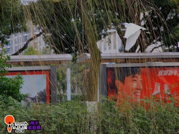 中國寧波網(wǎng)手機(jī)記者阿平賣白搭:中午帶著相機(jī)在大劇院附近尋找目標(biāo),發(fā)現(xiàn)一只白鷺在覓食,我撥好快門,悄悄地靠近,但最終還是被它發(fā)覺了,當(dāng)它起飛那一刻,我按下快門,仔細(xì)一看,竟然和劉翔的廣告牌拍到一起了,白鷺飛向劉翔,那就叫飛翔吧!