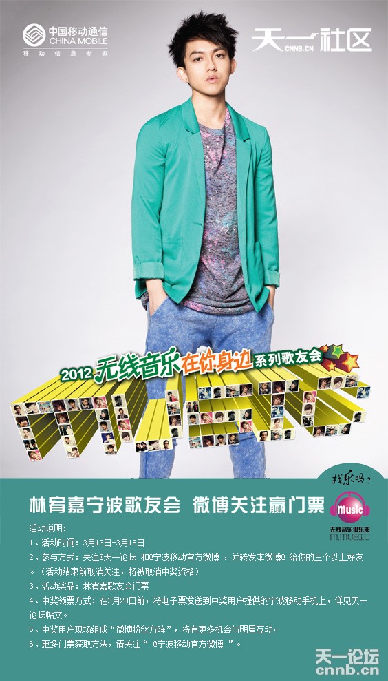 活動內(nèi)容:粉絲同時關(guān)注@天一論壇和@寧波移動官方微博,轉(zhuǎn)發(fā)活動博文并@三個以上好友,有機會獲得歌友會門票等獎品。