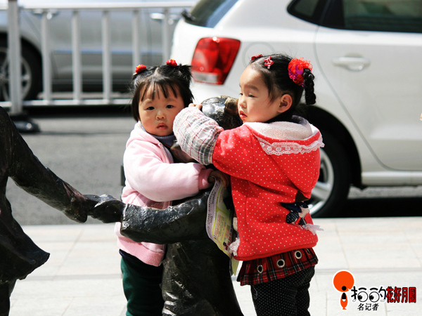 “他是我的!”“是我的!”2個(gè)小女孩搶抱著一個(gè)雕塑小男孩遲遲不肯松手,看來這位“小男孩”的艷福不淺。