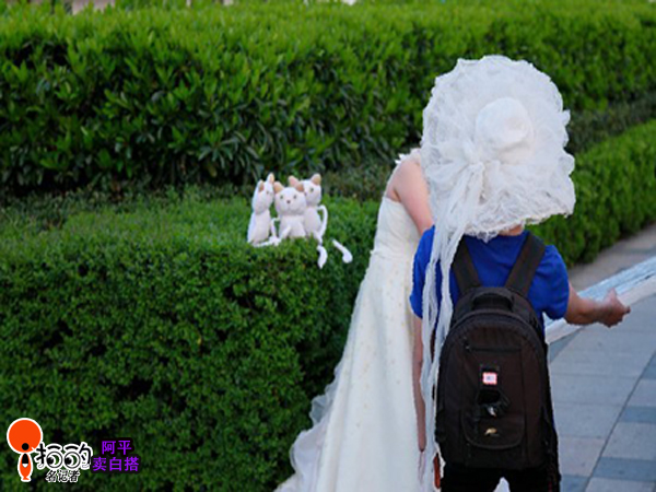 公園里,一對新人正在拍婚紗照,攝影師、燈光師正忙著為新人指點拍攝技巧,在一旁的“小貓咪”可是亮點,搶了新郎新娘的風(fēng)頭。