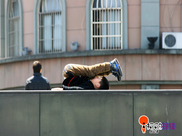 周末,一位小朋友躺在天一廣場舞臺緣石上享受著溫暖的陽光,突然興致很好,來了一個倒?jié)L翻,漂亮的動作剛好被我鏡頭捕捉到了!