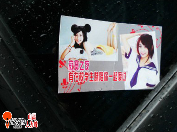 中國寧波網手機記者山高人為峰:在路口,在停車場,車窗被插上小廣告的車主不在少數(shù),都是些代開發(fā)票、貸款、刻章等等的虛假廣告為常用見,近來“學生妹”的小廣告在甬城的一些停車場里的車窗上出現(xiàn)!不知誰人來監(jiān)管,又有誰人會“寂寞”!