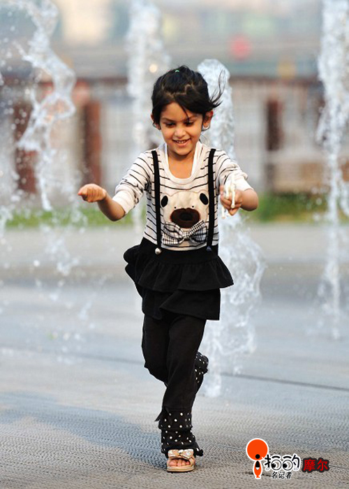 可愛小女孩在媽媽帶領(lǐng)下玩噴泉