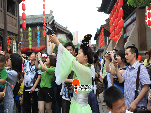 拍客們首先參觀了神雕俠侶城,整座影視城建筑以宋代風(fēng)格為主,古戰(zhàn)場(chǎng)、歸云莊、活死人墓等這些電視劇里耳熟能詳?shù)牡孛,引起了大家濃厚的興趣,個(gè)個(gè)加快了腳步,想要一探究竟,繞過(guò)一片不大的樹(shù)林后,便恍如穿過(guò)了時(shí)光隧道。踏著鵝卵石或青磚鋪成的小道,徜徉在古色古香的襄陽(yáng)古城,周?chē)峭唔斍啻u的小樓,偶爾還有幾位宋裝打扮的工作人員經(jīng)過(guò),要不是看見(jiàn)周?chē)娜思娂娔贸隽爽F(xiàn)代化的攝影器材,真有一種回到宋朝的感覺(jué)。