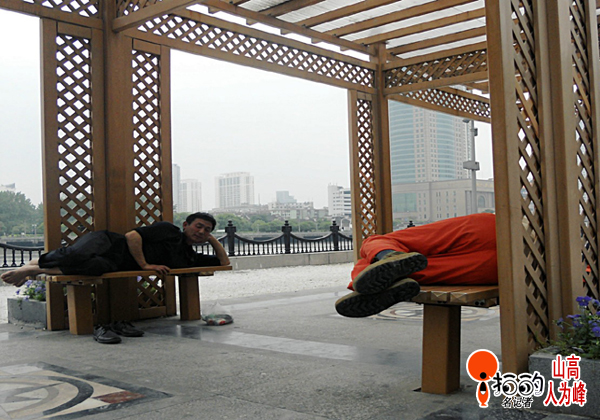三江口,外灘江邊休息椅太“短”...椅寬太“窄”......嗨!哥們,你老婆喊你回家睡覺呢!