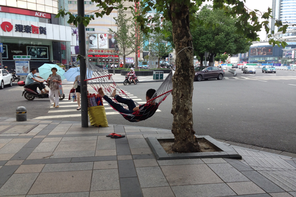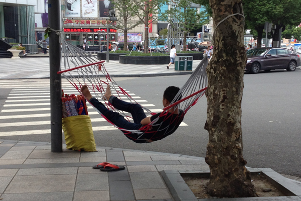 中國寧波網(wǎng)“I拍”記者過云雨:中午出去辦事,在二百對(duì)面見一小伙子躺在吊床上睡覺,似乎很愜意。路過他身旁時(shí),小伙突然抬頭問:師傅,吊床要嗎?30、50都有,質(zhì)量好能承受400斤重。真是邊休息邊做生意兩不誤啊,哈哈!