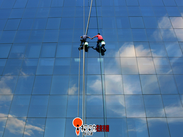 中國(guó)寧波網(wǎng)“i拍”記者花好月圓:也許是天空臟了,擦洗一下吧!兩位清洗玻璃幕墻的“蜘蛛人”正在鎮(zhèn)海經(jīng)濟(jì)開(kāi)發(fā)區(qū)的北歐工業(yè)園清洗幕墻,那天更好天氣晴好,玻璃幕墻上倒影出來(lái)的藍(lán)天和白云,感覺(jué)工人就好像在清洗天空一樣!