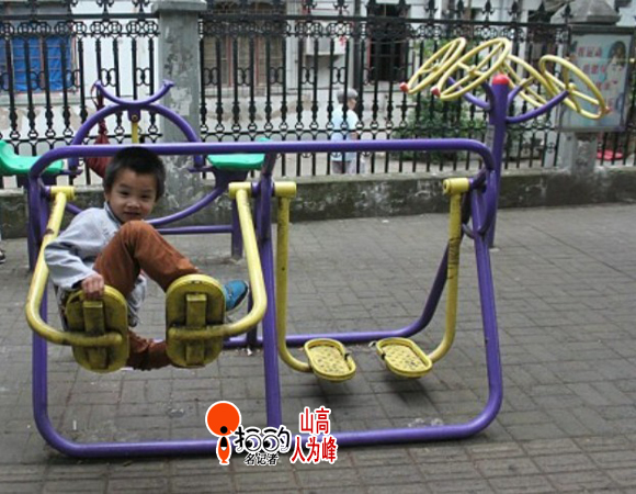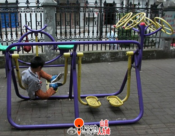 街頭路邊的健身設(shè)備很便民,只是如此坐姿左搖右晃倒也很愜意卻是不安全喲!不知是誰家的孩童快點喊聲回家吧!