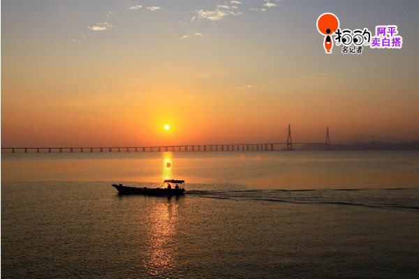 象山港大橋邊漁民頂著旭日迎著海風(fēng)出海捕魚(yú),多么美好的一天!